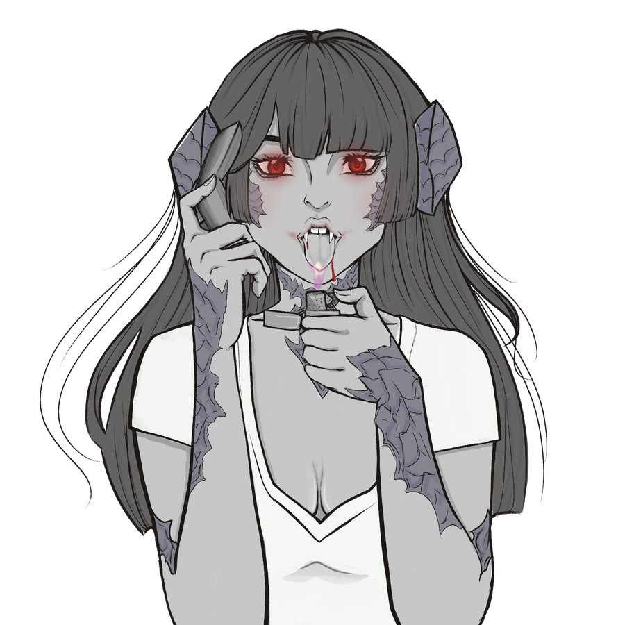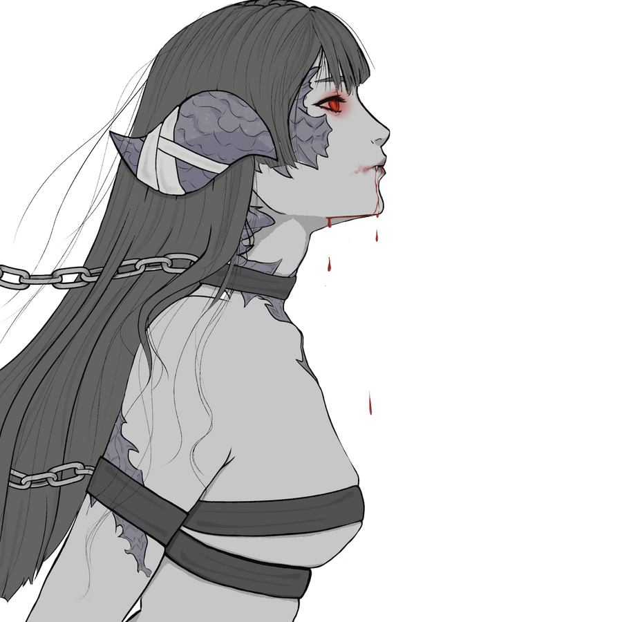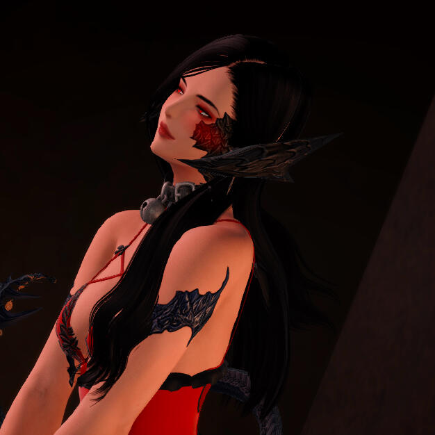 Memories of a past life now dead are blurry splotches that steadily fade from her new mind as time goes on. It would be grasping at smoke to recover but there’s some things that have stuck around the longest and brightest.Sarnai remembers she had a family. With time the distinct features of their faces faded but she knew she was loved. One of many siblings. As a child she was a bit too kind-hearted in comparison to them. She would weave together flower crowns from flora picked along the mountains and give them to the people of her tribe. Sarnai would shy away from violence and aspects of conflict that would arise between tribes in the Steppe. The mountains were a common place for her to hide and reside.An older woman’s hand was petting her head, her face a kind, heart-shaped face that resembled Sarnai’s. She knew she was in the mountains when everything changed, delicately weaving another set of crowns. Sarnai didn’t see It, but felt when It hit her. Like an invisible battering ram, all that had existed before ceased, body and soul writhing in agony with the distinct feeling of being shoved into an emptiness. The black emptiness pulled at her as harshly as It shoved her into it, but Sarnai didn’t go quietly. The more she fought against the new occupancy the more excruciating it grew to stand it, as if her simple worldly body wasn’t fit to house two entities. Just when she thought she’d finally had enough and would rather let herself drift into the inky black nothingness than experience one more second of this torture, everything changed. Rather than sense the entities confusion and impatience, she started to feel it herself. Even while her body still convulsed and jerked around in pain she couldn’t help feeling entitled and thought, ‘Let’s make this body mine.’ The shoving sensation turned into a new, even more violently strong pull inwards. Her pain was now coming in slow waves that burned like fire and left the parts it burned with residual warmth. She internally growled, and heard with slightly sharper hearing the harsh sound ripple up her throat and spit through her clenched teeth. From then on her body was always a few degrees hotter than what a normal Au Ra should be.Sarnai wasn’t sure for how long she’d been laying there, but she could sense the teen boy long before he saw her. Her eyes were closed but her horns picked up the hurried, worried pace his steps made, no doubt towards the screams of a young woman that he heard echoed off the mountains. Her chest expanded, filling her lungs with the scent of aether. Mmm. There was an indescribable smell to him, something that brought a strange taste to her mouth as it filled with saliva. She saw her own reflection in his terrified eyes as she suddenly coiled to leaped at him. Bright, glowing, ruby irises were hungry. He was only able to take a half step backwards before she was on him. Her pure agility and element of surprise won out over what greater strength no doubt the young male would have over the smaller xaela. If not for the spray of red that sprouted from him she almost appeared to be kissing his neck. His resounding scream was quickly cut off as endorphins spread through his system, the sound gurgling in his throat and turning into a garbled groan. His struggles ceased, though his life came after. Too soon! Strangely, as soon as she felt the thrum of his heart grow still, the taste of his blood grew sour. She lifted off of him, a hiss of distaste accompanying the steady drip drip of his still-warm blood falling from her lips.A small part of her, one that was tucked away as she fed and now suddenly came back recoiled in horror at the way her body naturally shivered with pleasure and how her tongue licked her lips as if wanting more. Another persistent part of her was still impatient yet alert, red eyes restless as they scanned the surrounding area for witness. It was disconcerting to experience the two parts of her that were both separate but melded together. Something she’d have to manage. If she felt any remorse, it didn’t show in the wild woman’s face, stony and stained in drying blood that trickled down her chin as she ran at an easy sprint. Sarnai barely needed to change her steady breathing, and she found herself able to cross great plains faster and with more stamina than before. Her stomach both soared and fluttered with the faint feeling of flying, only to twist in disgust. She knew the boy she killed and yet she so easily flitted away from his corpse to the river without a backward glance. The grief would come later, when the high of her first feed wore off and the evil inside of her lay dormant, sated. When she was relatively safe, laid beneath a large upturned root and curled on the soft earth did her tears finally spill, concealed with the rain that never seemed to end.Through trial, error, and eventually acceptance Sarnai developed her own twisted moral code to both keep herself from becoming completely controlled by her new instincts and salvage whatever remnants of her soul there were left.When in thirsting for aether, her more animalistic instincts start to take control; when full and sated she’s able to let reason rule over her mind. To keep herself comfortable she needs to feed every three days, and to keep herself from losing control she needs to feed at least once a week. While Sarnai’s unable to stop herself from losing control under starvation, she tries her best to keep herself fed on who she chooses, to prevent the worst part of her from taking more of her will.Her own moral code is sometimes difficult to abide by, especially when those who she doesn’t want to hurt hold such high counts of aether. The baser instincts she tries to save for those who in her mind deserve it: other predators. A different kind who’s sick tendencies have them preying on others for mere enjoyment. Her baby-like voice combined with her deceptively slender body are used to beguile and lure